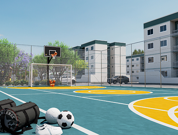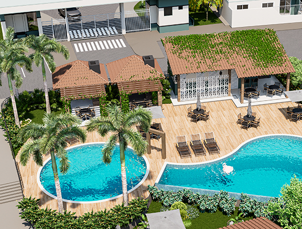 A área de lazer é um verdadeiro Resort, com piscina de borda infinita, quadra poliesportiva, churrasqueira, salão de eventos e playground. A segurança é reforçada com uma guarita e controle de acesso, além de 20 vagas externas para visitantes.