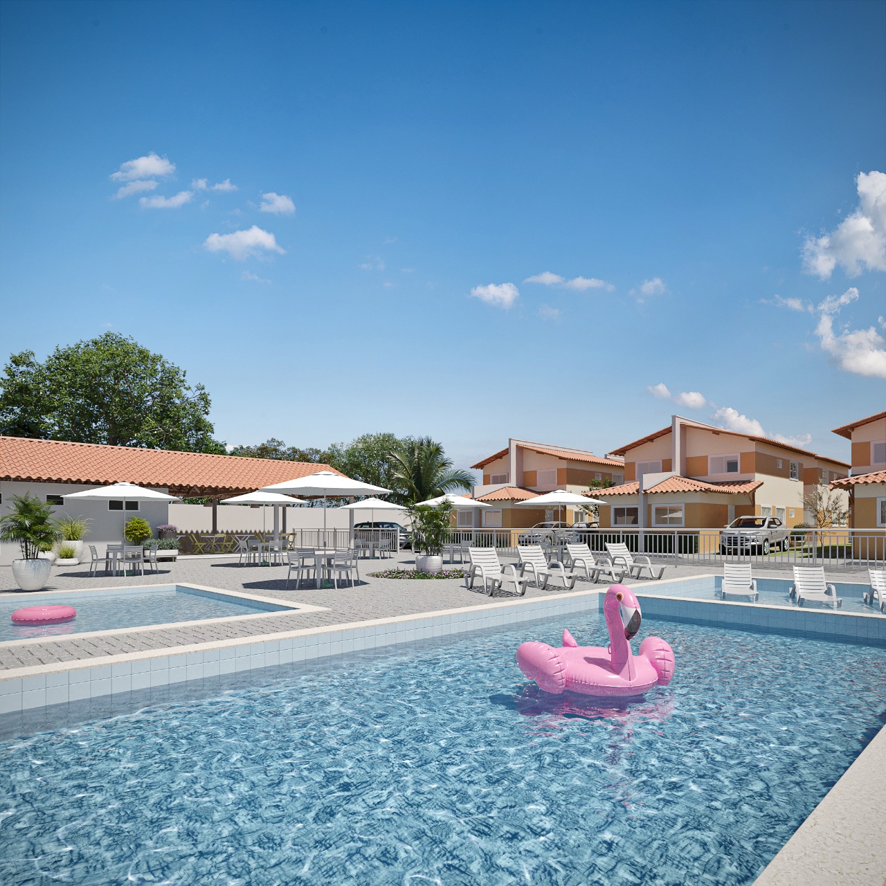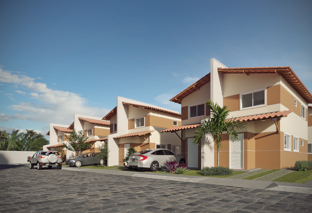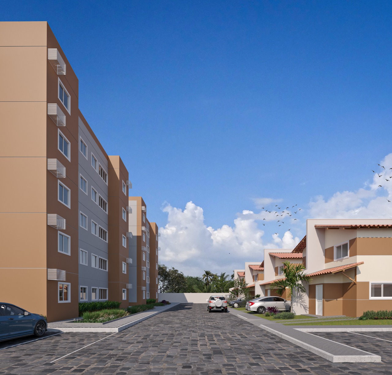 O condomínio possui casas duplex de 2 e 3 quartos, casas térreas acessíveis de 2 quartos e apartamentos de 2 quartos em edifício com elevador.