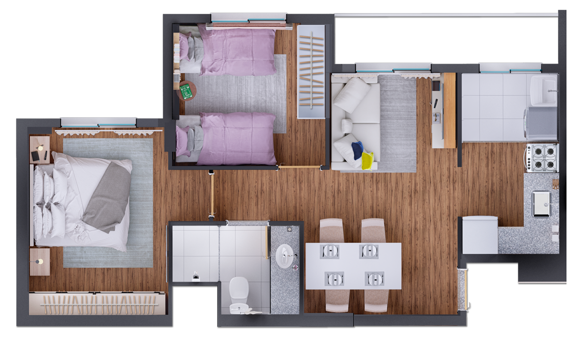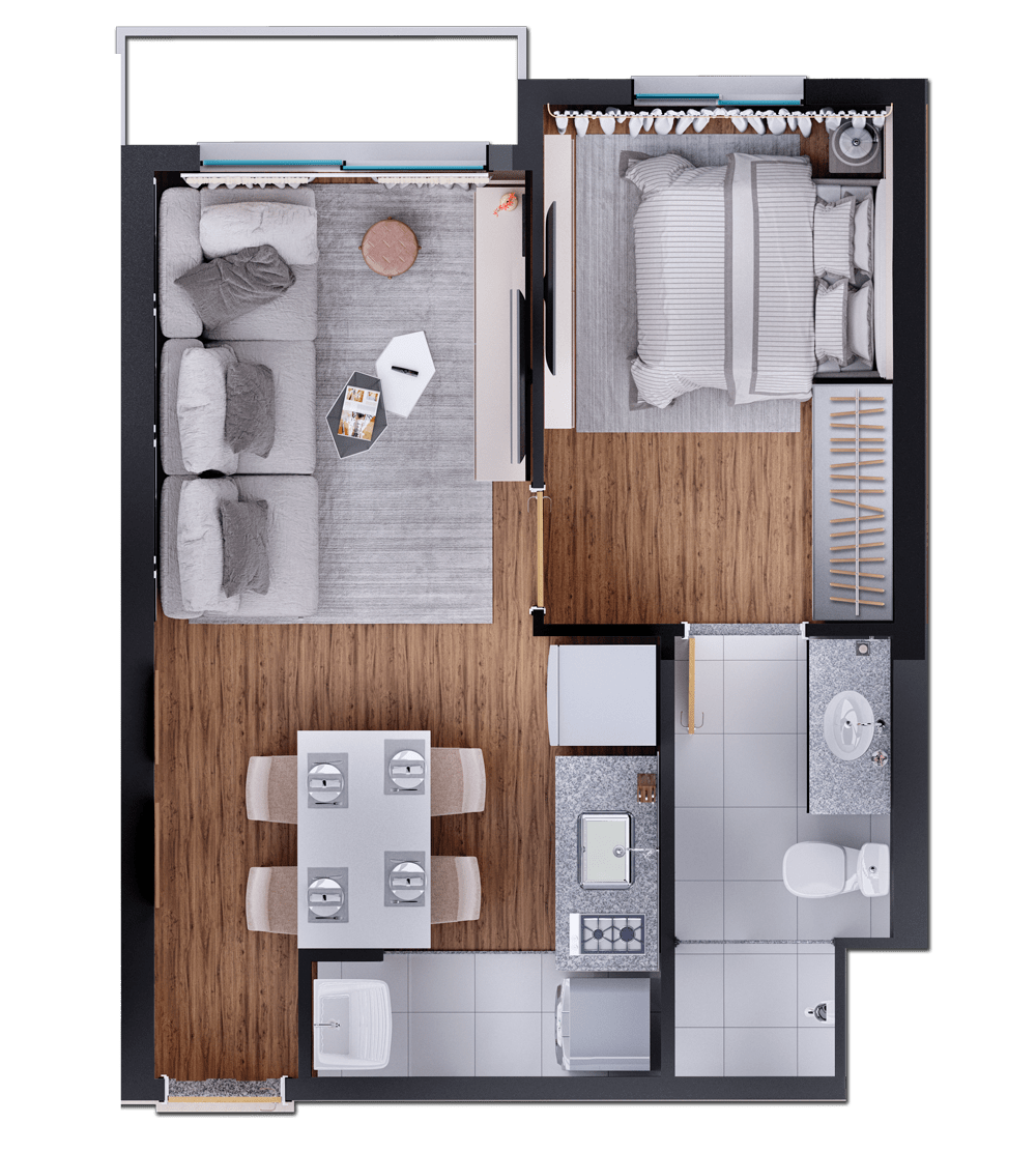 O empreendimento conta com dois tipos de planta, podendo ser de 1 quarto (35m2) ou 2 quartos (51m2).